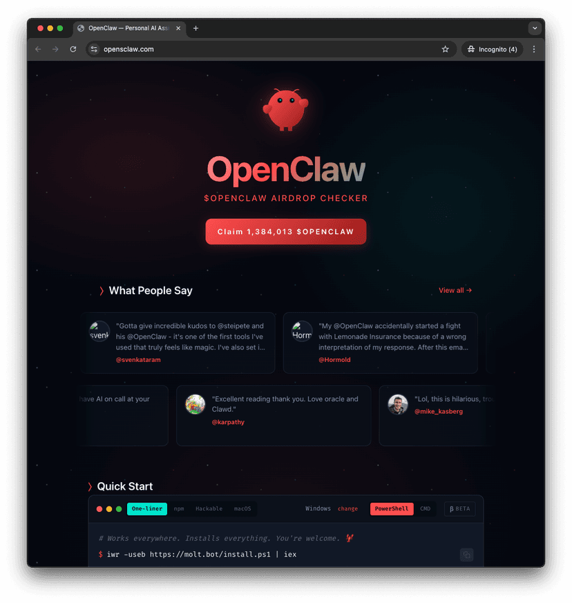 Openclaw trendaa parhaillaan, mutta valitettavasti huijarit ovat myös hereillä. Monet yrittävät hyödyntää ihmisten kiinnostusta tarjoamalla vääriä asennussivustoja, jotka voivat johtaa haittaohjelmiin tai tietojen kalasteluun. Sivustoja putkahtelee kuin sieniä sateella, ja ne näyttävät usein hyvin aidoilta.